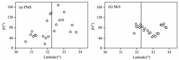 图 6 KS和Pms的快波方向随纬度变化的特征 Fig. 6 Variation of the fast direction with the latitude for SKS and Pms |