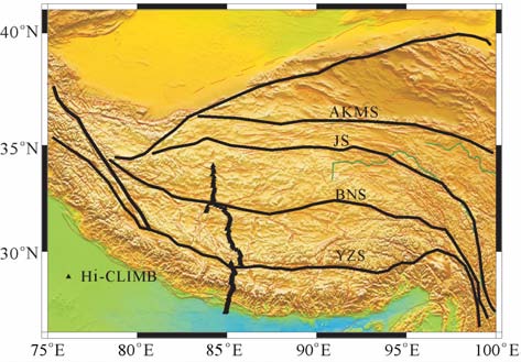 图 1 HICLIMB测线位置 YZS—雅鲁藏布江缝合带 Yarlung Zangbo River Suture zone, BNS—班公一怒江缝合带 Bangong-Nujiang Suture zone,JS — 金沙江缝合带Jinshajiang Suture zone,AKMS—阿尼玛卿一昆仑 —木孜塔格缝合带 Animaqing-Kunlun-Muzitage Suture zone. Fig. 1 ICLIMB project distribution |