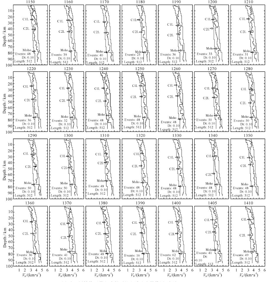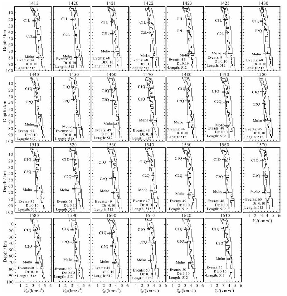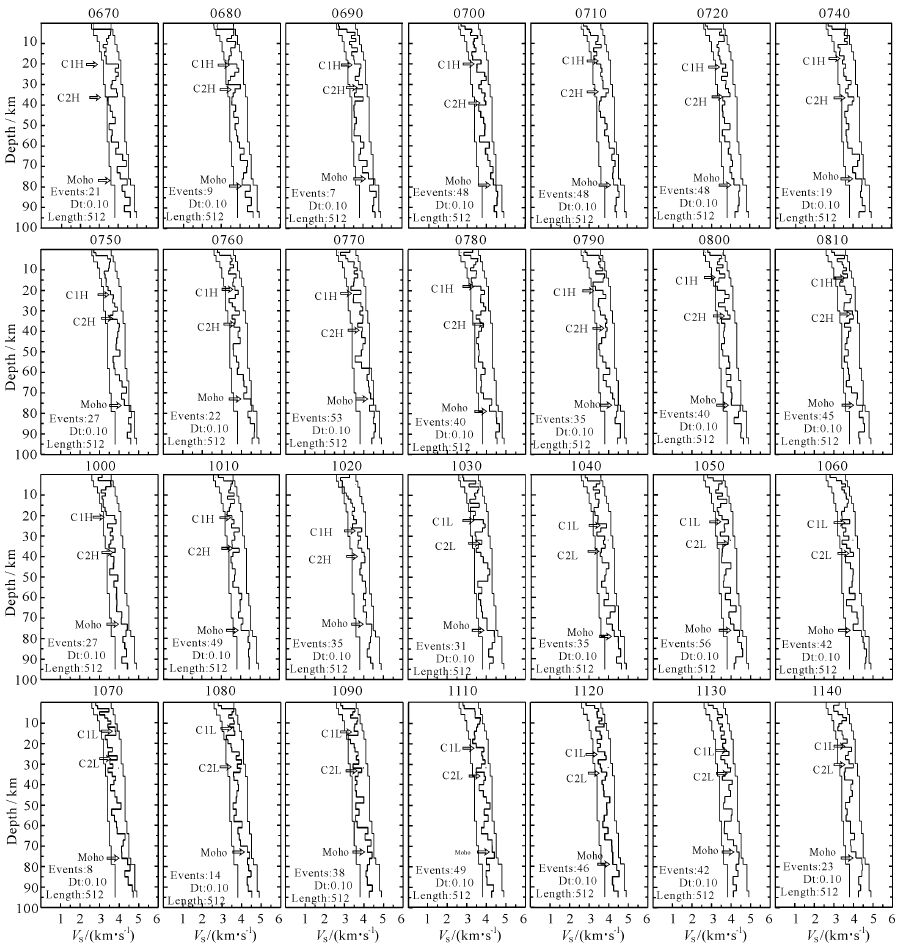 图 3a 用转换函数方法得到的S波速度结构图(台站0670〜1140). Events为反演计算时使用的地震记录数,Dt为资料 采样间隔(单位s),Length为采样长度(点数).C1H、C2H表示喜马拉雅地体地壳内S波速度分界面,C1L、C2L表示拉萨 地体地壳内S波速度分界面,C1Q、C2Q表示羌塘地体地壳内S波速度分界面 Fig. 3a S-wave velocity structurebelow the stations obtained from transform function method (Station 0670 〜1140).Events indicates the number of the seismic records used in invertcalculation,Dt is the sampling interval of records(s),and Length is the sample length (number). C1H andC2H,C1L andC2L,C1QandC2Q denote S-wave interfaces in Himalayan,Lhasa and Qiangtang block crust,respectively |