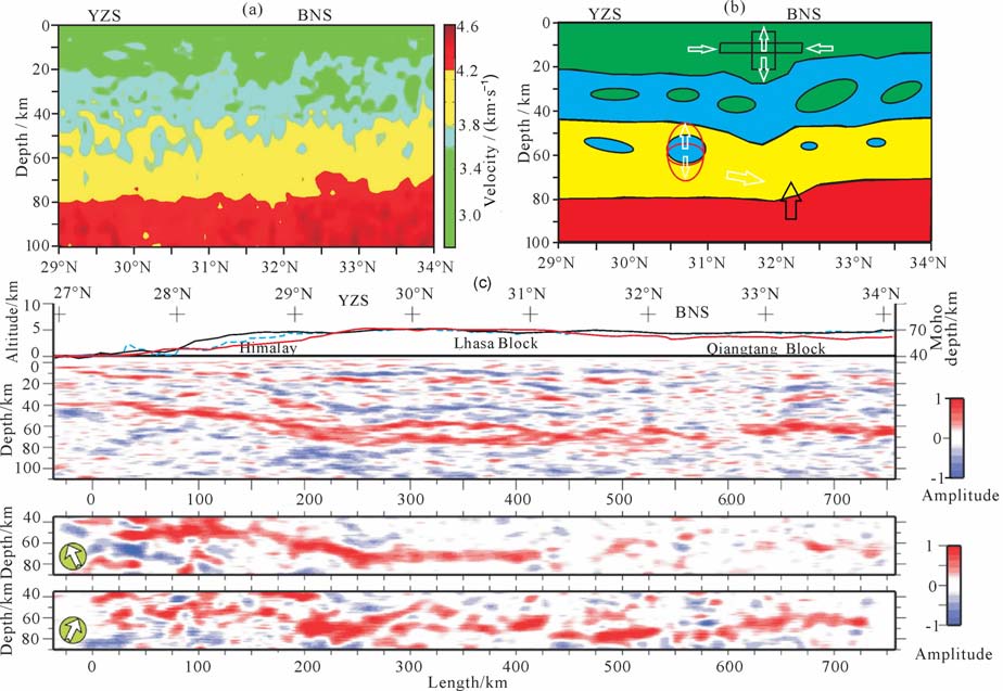 碰撞过程与壳内物质运移、厚度变化及高原抬升的关系.拉萨地体上地壳最厚,喜马拉雅地体上地壳次之,羌塘南段上地壳最薄;羌塘南段中地壳最厚,拉萨地体中地壳次之,喜马拉雅中地壳最薄;拉萨地体下地壳最厚,羌塘南段下地壳次之,喜马拉雅下地壳最薄.此构造格局的形成与欧亚板块与印度板块碰撞过程以及各个块体物理性质密不可分.作为这一现象的一种解释是,欧亚板块与印度板块碰撞过程中,使得夹在中间的拉萨地体强烈变形增厚,导致拉萨地体内地壳随着深度的增加,其横向范围缩短,在N31.5°附近中地壳具有速度倒转特征,根据不清晰的莫霍面形态和下地壳倾斜特征,说明此处为印度与欧亚板块碰撞交汇线,拉萨地体地壳物质沿该处莫霍面间断位置挤入地幔,在地幔下沉的同时,部分地幔物质上涌,对下地壳进行改造(图 4b),造成下地壳以高速为主,中地壳发生部分熔融,而上地壳在南北挤压力的条件下发生堆积增厚,是此处高程明显高于附近的主要原因(图 4b中黑色矩形表示的刚性、脆性变形);来自印度板块物质在下地壳(N30°附近,延伸100 km)发生榴辉岩化[38, 49],具有很强的塑性,塑性增强不仅为壳幔解耦创造了有利条件,而且在南北方向挤压的情况下,易发生物质的纵向生长(图 4b中红色椭圆表示的塑性形变),使得此处地表高程超过附近地区;中西部印度地壳挤入青藏高原,没有在雅鲁藏布江缝合带南侧大量堆积起来,而是沿滑脱层继续挤入拉萨地体,一直到班公-怒江缝合带,受阻于岩石圈巨厚的羌塘地体,部分物质堆积在缝合带南侧形成巨厚地壳,一部分沿缝合带向东、西两侧运移[60];羌塘地体形成年代早于拉萨地体,因此羌塘地壳比喜马拉雅地壳稳定,刚性强,上地壳不易变形,而喜马拉雅地体上地壳则明显增厚.
