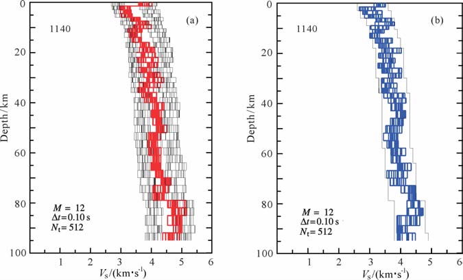 图 5 用自助法(a)和交叉验证法(b)验证1140台站的反演结果.M为反演计算时 使用的地震记录数,$\vartriangle t$为资料采样间隔,Nt为采样长度 Fig. 5 The Bootstrap(a) and Crosi-validation(b) test for resolution of the inversed results at station 1140. M indicates the number of the seismic records used in invert calculation,$\vartriangle t$ is the sampling interval of records,and Nt is the sample length |