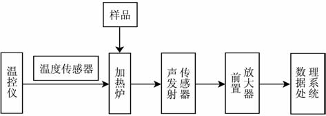 2 样品和实验方案 2.1 实验仪器本次实验的仪器为自行研制的岩石热声发射仪,是通过人工升温,根据热Kaiser效应测定岩石经历过的最高地温的仪器.岩石热声发射仪主要由温控系统、加热系统、自动控制与数据采集系统组成(图 1),最高加热温度为800℃.该仪器采用致密氧化铝作为波导杆将声发射信号传至传感器,确保声发射信号的有效发射和接收,即确保良好的声学耦合;信号采集系统使用了美国物理声学公司PCI-2声发射系统.