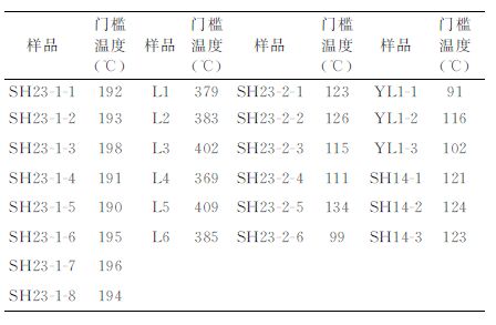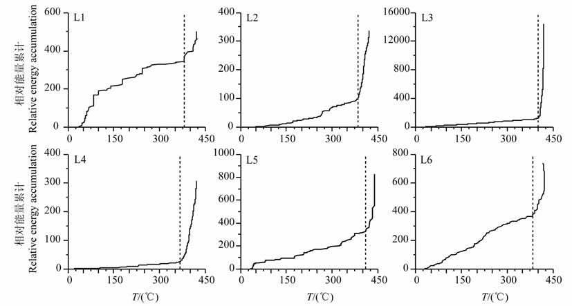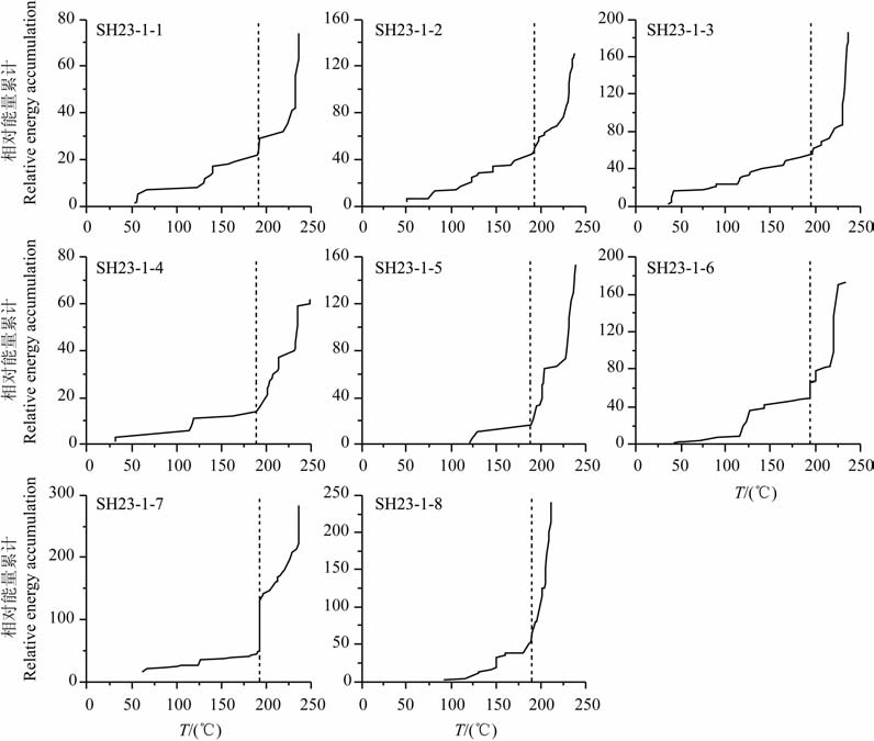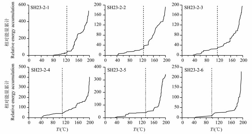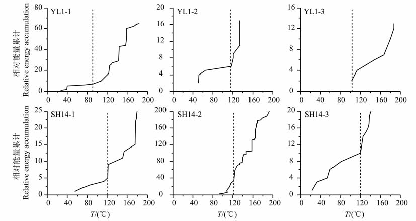 YL1和SH14 泥岩样品滤波后声发射信号数量很少且分散,导致相对能量曲线成阶梯状,样品的门槛温度为曲线斜率初次明显增大时的温度(图 5).除样品YL1-1埋深较浅,测量值与样品实际经历的最高温度相差10℃以上,其余样品的门槛温度与它们经历的最高温度接近(表 1,表 2).