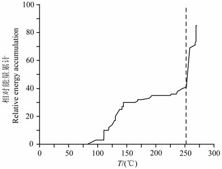 4 时间因素对岩石热声发射测温的影响前人通过研究岩石的力Kaiser效应认为时间因素会使岩石的记忆能力衰退[24, 25],那么时间也可能对岩石记忆温度的能力产生影响.为探讨在漫长的地质历史中时间是否会影响热声发射技术测量岩石经历的最高古温度的准确性,本次实验还测量了川西地区龙深1 井中三叠统顶的灰岩样品LS1(5865m)的门槛温度.川西地区在早白垩世末地层埋深最大,地温达到最高值,有学者通过镜质体反射率法和粘土矿物相转变法等综合研究得出川西地区中三叠统顶部最高古地温曾达到267℃[26].样品LS1自室温开始以2℃/min的升温速率加热至300℃.样品的能量累积曲线在252℃ 时斜率骤然增大,Kaiser效应出现(图 6);该温度较前人的研究成果稍低.实验结果表明时间对热声发射测温有一定的影响,漫长时间会导致岩石记忆温度的能力有所退化,但其产生的误差不大,进一步验证了热声发射技术用于测量岩石最高古温度的可行性.