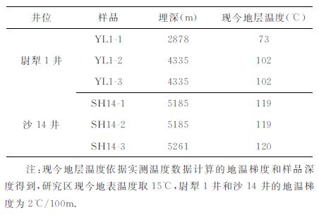 表 1 YL1井和SH14井泥岩样品埋深及现今地层温度 Table 1 Depth and present formation temperature of mudstone samples in Wells YL1 and SH14 |