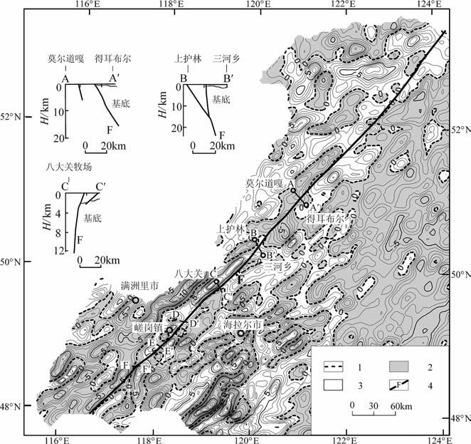 2.2 大地电磁测深特征对研究区的3条1:100万MT 剖面资料进行了处理和解释,根据视电阻率等值线的分布形态对德尔布干断裂进行了识别并划分了构造分区[5].在莫尔道嘎镇-得耳布尔镇之间(图 2A-A″),断裂在电法剖面上是两个构造单元分界线,西侧为额尔古纳地槽褶皱带,东南侧为根河盆地;在上护林-三河乡之间(图 2B-B″),断裂西侧为额尔古纳地槽褶皱带,东南侧为拉不大林盆地;在八大关牧场东南地区(图 2C-C″),西侧为嵯岗隆起,东南侧为贝尔湖坳陷,三个剖面中断裂两侧电性存在明显差异,西侧隆起区的电阻率远高于东侧盆地区的电阻率.电阻率的曲线形态反映了断裂向南东倾斜.MT 对断裂反演结果与重力获得的结果基本相同,印证了断裂的存在和分布.