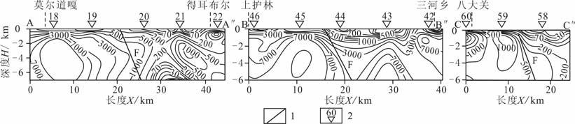 图 2 德尔布干断裂电法解释剖面(据刘财等[5]) 1德尔布干断裂;大地电磁测深测点;剖面A-A´、B-B´和C-C´在图 1中的位置分别同A-A' B-B' C-C'. Fig. 2 The explanation profiles of electrical method (after Liu C et al. [5]) 1 Derbugan fault;2 The measure point of MT;The profiles position of A-A´,B-B´and C-C´ are same with the profiles position of A-A',B-B' and C-Cf in Fig. 1. |