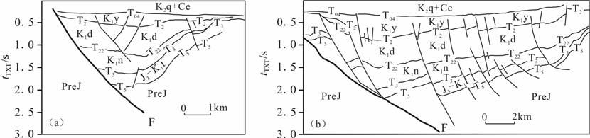 图 3 海拉尔盆地德尔布干断裂地震剖面解释图 (a)红旗凹陷424线地震剖面解释(剖面图位置见图 1E-E';(b)乌尔逊凹陷1182线地震剖面解释(剖面图位置见图 1F-F'.K2q-Ce,上白垩统青元岗组-新生界;K1y,下白垩统伊敏组;K1d,下白垩统大磨拐河组;K1n,下白垩统南屯组;J3-K1U上侏罗统-下白垩统塔木兰沟组-铜钵庙组;PeJ,前侏罗纪基底. Fig. 3 Geological interpretation of seismic profiles of the Derbugan fault in Hailar basin (a) Geological interpretation of seismic profiles of Hongqi depression line No. 424 (The position of seismic profiles see Fig. 1 E-E');(b) Geological interpretation of seismic profiles of Urxun depression line No. 1182 (The position of seismic profiles see Fig. 1 F-F') K2q-Ce,Qingyuangang formation of Upper Cretaceous-Cenozoic erathem; K1y,Yimin formation of Lower Cretaceous; K1 d,Damoguaihe formation of Lower Cretaceous; K1n,Nantun formation of Lower Cretaceous; J3-K1t,Tamulangou-Tongbomiao formation of UpperJurassic-Lower Cretaceous;PreJ,Basement of PreJurassic. |