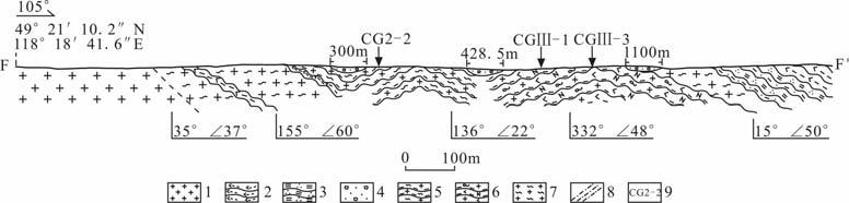 图 4 嵯岗德尔布干断裂实测地质剖面图(剖面图位置位于图 1D-D') 1 黑云母花岗岩;2 黑云角闪片岩;3 白云母石英片岩;4 第四系;5 花岗质条纹状构造片麻岩;6 花岗闪长质条带状构造片麻岩;7 片麻状花岗岩;8 糜棱岩;9 样品号. Fig. 4 The measured geological section drawing of Derbugan fault in Qagan (The position is in Fig. 1D-D') 1 Granitite;2 Biotite hornblende schist; 3 Mca-quartz schist; 4 Quaternary; 5 Granitic streaked tectonic ;6 Granodioritic banded tectonic gneiss;7 Gneissic granite;8 Mylonite;9 Mamplenumber |