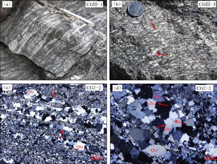 图 5 嵯岗伸展变形带野外及显微照片(照片在实测剖面中的位置见图 4) (a)花岗闪长质条带状构造片麻岩野外露头,条带状构造由浅色长英质矿物相对集中的条带和暗色角闪石、黑云母相对集中的条带相间 排列而成;(b)箭头指示眼球状构造,它们是细密的长英质矿物条带经剪切、塑变拉断和旋转应变而成;(c)花岗质条纹状构造片麻岩显微 照片,箭头指示条纹状构造,由竹节状石英条带与细小的粒状长英质矿物所组成的条带相间排列而成,正交偏光;(d)箭头指示竹节状石英条带中的三边平衡结构,正交偏光. Fig. 5 Field and micro-photos of large extensional deformation zone in Qagan (The position of photos in the measured geological section,see Fig. 4) (a) Outcrop of the granodioritic banded tectonic gneiss,banded structure s made up of relatively centralized banding of light-colored felsicmrneral and relatively centralized banding of dark-colored hornblende and biotite,which is interphasely arranged; (b) The arrow points ataugen structures ,which form the thin and dense felsic mrneral bands after shear,plastic deformation,tension fracture and rotational strain; (c) Photomcrographs of the granitic streaked tectonic gneiss,the arrow points at streaky structure,which s made up of the banding of bamboo-shaped quartz and the fine particle felsic mineral,which s rnterphasely arranged,crossed polars;(d) Photomicrographs,amongwhich the arrow points at the three edges equilibrium texture of the bamboo-shaped quartz ribbons,crossed polars. |