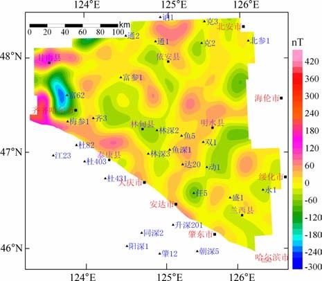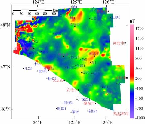 图 5 松辽盆地北部基岩岩性磁异常平面等值线图 Fig. 5 Plane isoline map of magnetic anomaly of basement lithology in north Songliao basin |