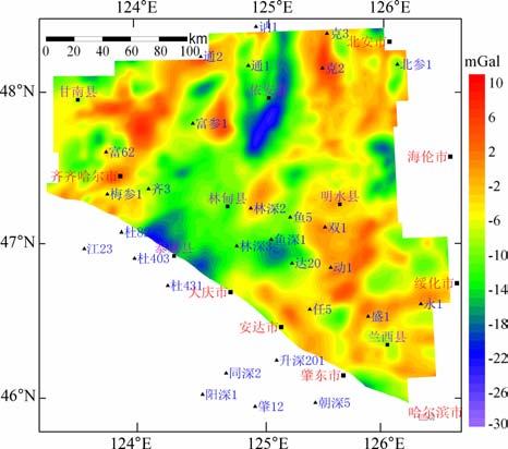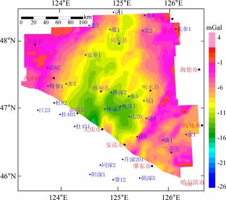 图 2 松辽盆地北部布格重力异常图 Fig. 2 Plane soline map of bouguer gravity anomaly |