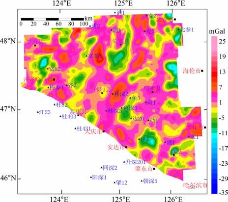 图 3 松辽盆地北部盖层重力异常效应图 Fig. 3 Plane soline map of gravity anomaly effect of cap-rock in north Songliao basin |