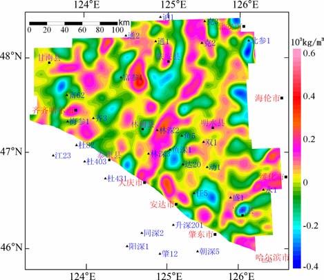 图 6 松辽盆地北部基底相对视密度图 Fig. 6 Plane soline map of apparent densityin the north base of Songliao basin |