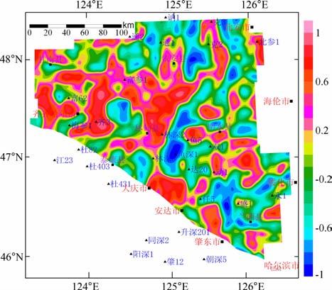 图 8 松辽盆地北部基底视密度与视磁化率相关系数 Fig. 8 Plane soline map of correlation coefficient ofbase apparent density and apparent magneticsusceptibility in the north Songliao basin |