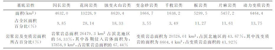 通过钻遇基岩探井的岩性及所预测滨北地区的基岩岩性综合分析,松辽盆地的基岩岩性较为复杂,总体可以分为古老变质岩类、浅变质岩类、动力变质岩类、蚀变火山岩类及不同时期的侵入岩类(表 1).造成基岩岩性的复杂是与松辽盆地的构造演化及各个不同地质时期所处的大地构造位置分不开的.基岩岩性在一定程度上记录了松辽盆地在不同时期所处的大地构造环境.松辽盆地在元古宙、古生代-中生代直至晚中生代-新生代经历了多岛洋盆的关闭、地块相互拼合,古亚洲洋发育、闭合及滨太平洋大陆边缘构造活动等作用,使松辽盆地的演化极为复杂,先期的地层受后期构造运动的改造及破坏并发生一定的变质作用,新的地层又不断形成.在各期演化活动中,形成了规模不同新老的断裂,伴随断裂的活动及断裂的形成,沿活动的断裂及新产生的大断裂发生岩浆侵入或喷发活动,形成各期的侵入岩及火山岩,早期形成的火山岩及地层在后期构造中又进一步发生蚀变作用,产生蚀变火山岩及不同变质程度的变质岩.早期的岩浆侵入还存在融透侵入现象,使得盆地出现规模较大的侵入体(岩基),随着演化的不断深入老地层分布范围将逐步减少.