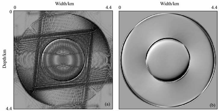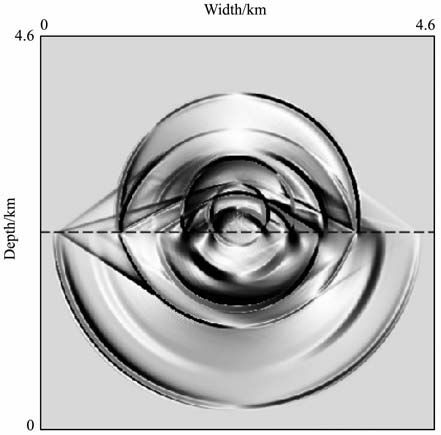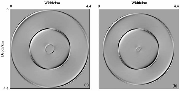 从图 1可以看到,如果不使用FCT 处理技术,波场快照中存在数值频散以及由震源离散所引起的源噪声.这些数值频散和源噪声的存在,使得图 1a所示的波场非常不清楚;而在FCT 紧致差分方法得到的波场快照中,由于引入了FCT 技术处理,所获得的波场变得非常清晰,没有任何可见的数值频散和源噪声(见图 1b).这说明FCT 处理技术可以有效地压制数值频散和源噪声.