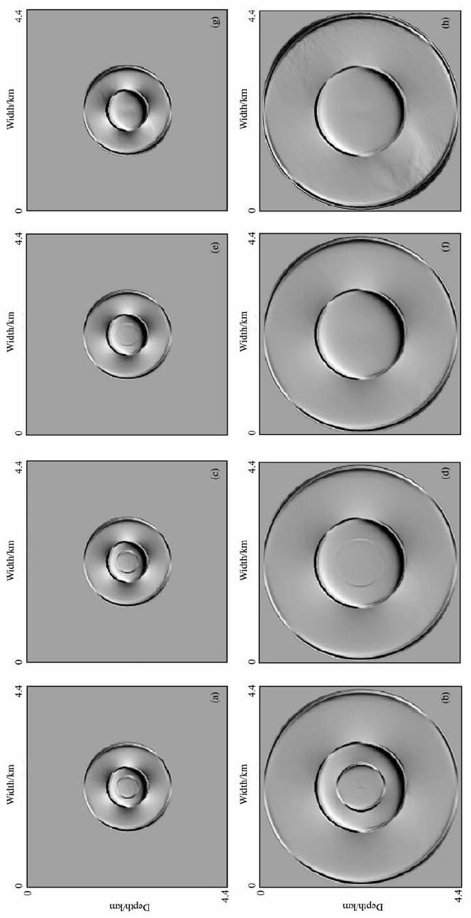 图 3(a~h)分别对应于4种情况下T=0.27s和T=0.6s时刻的波场快照.图 3表明,4种不同情况下的弹性波场中都存在3种不同的波,它们在波场快照中由外到内依次为:快P波、S波和慢P波.每种波形的波前面都是以震源为中心的圆形,其各向同性特征十分明显.同时我们也可看到,随着耗散系数b的增大,慢P波的速度也随之增大,但是其能量衰减的速度也显著加快.另外,整个波场波形都非常清晰,无数值频散,这再次说明FCT 处理技术能够有效压制数值频散和源噪声.