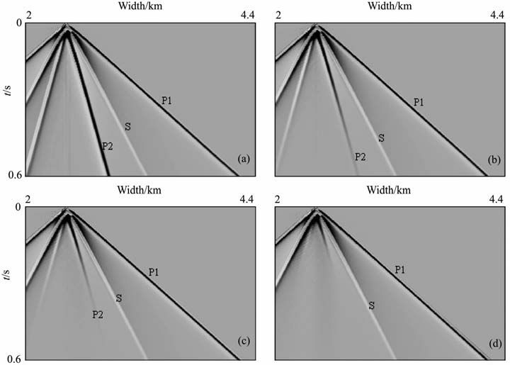 图 4 模型3中固体ux分量的合成地震记录 (a)b=0;(b)b=5. 625;(c)b=11. 25;(d)b= 22. 5. Fig. 4 The seismic records of the solid displacement component ux |