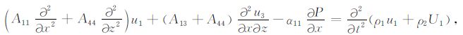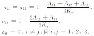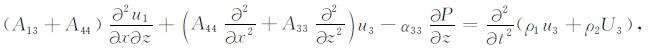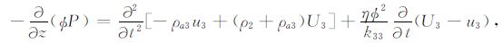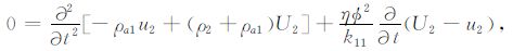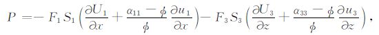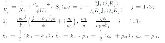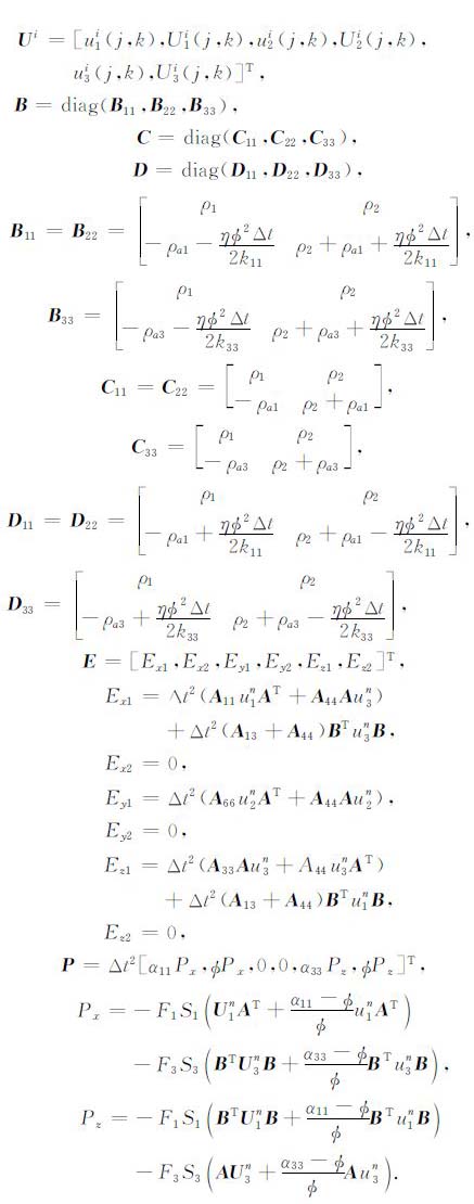 ui和Ui(i=1,2,3)分别表示固体和流体在x、y和z方向上的位移分量,Φ 为孔隙度,ρs 和ρf 分别为固体和流体密度,ρai(i=1,3)为第i方向固-流耦合附加质量密度,ρ1 表示单位体积内固体质量,ρ2 表示单位体积内液体质量,η为流体黏滞系数,P为流体压力,Ks 为固体骨架体积模量,流体体积模量Kf可由流体声速