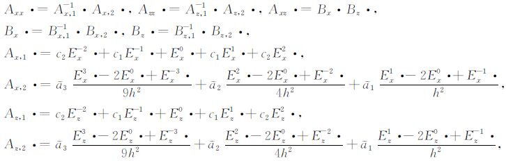 系数c2,c1,$\tilde{a}$1,$\tilde{a}$2,$\tilde{a}$3 是二阶紧致差分格式(11)中的系数.Exk·ui,jn=ui+kn,j,Ezk·ui,jn=ni,j+ku.同理可写出Bx,1·,Bx,2·,Bx·,Bz,1·,Bz,2·,Bz·,只是其系数是一阶紧致差分格式(9)中的对应系数.