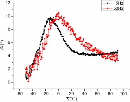 对黏弹性材料施加一个正弦应力作用时,它所产生的应变滞后于应力一个相位角δ(0°<δ<90°).常用tanδ=Ei/Er 来表征岩石的动态力学行为.其中Er 为与应变同相位的实数部分模量,它反映岩石受力变形时变形能在样品中储存的量,称为储能模量.Ei 是与应变相位相差π/2 的虚数部分模量,表示岩石受力变形时能量损耗的多少,常称为损耗模量.当损耗模量很小时,可以近似地认为δ=tanδ.损耗模量Ei 和内耗tanδ 出现一个极大值.合理定义一个反映岩石滞后程度的物理量,并与衰减值Q-1(tanδ)进行比较,是在讨论弛豫、滞后和衰减中面临的一个新问题[17].图 1 为用Metravib 热机械分析仪采用正弦波加载获得的泵油饱和彭山砂岩2耗散角δ 随温度的变化.由图可见,当频率为5Hz时,δ 峰的峰位在-12.4℃左右,δ 峰值强度为9.79°;当频率提高到50 Hz时,δ 峰的峰位升到约0.1℃ 左右,δ 峰值强度增加到10.5°.可见随频率的不断提高,δ 峰峰位向高温方向移动;δ 峰值强度增大.