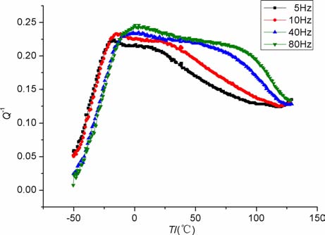 图 2为泵油饱和自贡长石砂岩衰减随温度的变化.由图可见,当频率为5Hz时,衰减峰的峰位在-16.5℃左右,衰减值为0.22.当频率升到10 Hz时,峰位移到了-15.5℃,衰减值为0.23;当频率提高到40Hz时,峰位已向高温方向移到了-1.4℃,衰减值为0.24;当频率最后提高到80 Hz时,峰位也向高温方向移到了0.4℃,衰减强度升到0.25.可见,衰减峰峰位随频率提高向高温方向移动,峰值强度升高的规律与图 1一致,也符合热激活弛豫规律.