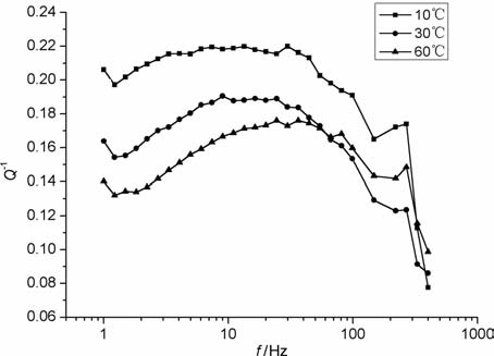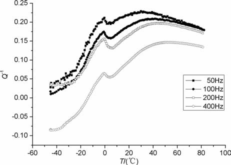图 3 为泵油饱和彭山砂岩5 衰减随温度的变化.由图可见,当频率为50 Hz时,衰减峰的峰位在29℃左右,衰减峰的强度约为0.23.当频率升到100Hz时,衰减峰峰位已向高温方向移到37℃ 左右,峰的强度约为0.21.当频率提高到200 Hz时,峰位已向高温方向移到42℃左右,峰的强度约为0.195.当频率最后提高到400Hz时,峰位向高温方向移到52℃左右,峰值强度已降至0.15.可见,衰减峰峰位随频率提高向高温方向移动的规律与图 1、2 一致,也符合热激活弛豫规律.只是衰减强度随频率的升高而降低与图 1、2随频率的提高衰减强度增大的结果正好相反(0℃左右曲线波动是由静载波动引起).