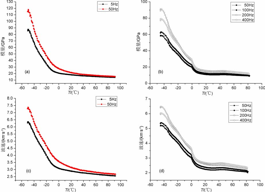 图 5为泵油饱和彭山砂岩模量和波速随温度的变化,其中彭山砂岩5 号在0℃ 左右模量和波速曲线的波动是由静载波动引起.可见,彭山砂岩随着温度的升高模量下降,弹性波速随温度升高也下降,在0℃以下模量和波速值较大,随温度升高,下降的梯度也大.在0℃ 以上彭山砂岩的模量和波速随温度升高缓慢下降,波速值基本在3km/s以下.随着频率的增高模量波速均增大,具有频散效应;随着温度的升高,频散效应有减弱的趋势.