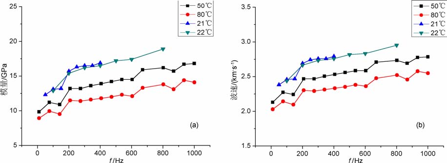 由图 6可见,彭山砂岩在1~1000 Hz的频率范围内随着频率的增高模量波速增大,5 Hz左右,波速约2.3km/s, 当频率升高到1000 Hz时,波速增大到2.7km/s, 与Batzle等[13]所测得的北海砂岩不同频段的波速有类似之处,同样也具有较强的频散效应,与北海砂岩相比泵油饱和彭山砂岩的频散效应似乎更强一些.随着温度的升高,模量、弹性波速度也下降.由于系统的共振频率在150 Hz左右,模量、弹性波速度随频率变化曲线在150 Hz左右存在一较大波动,这显然是受共振频率的影响.其中在21℃有一条模量随频率变化曲线,频率只作到400Hz, 它在22℃ 曲线稍上面紧挨着22℃ 曲线,可见21℃曲线与22℃ 曲线的差别是温度升高1℃ 引起的;从另一角度来看,21℃ 曲线也是对22℃ 曲线的一个印证,说明该设备的测试精度较高,实验数据可靠.