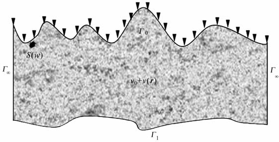 2 方法原理与基本方程广义Lipmann-Schwinger积分方程由边界波动积分方程与Lipmann-Schwinger体积分方程两部分构成,描述地震波在分区非均匀介质(一种具有不规则边界、内部为随机非均匀介质的多层结构)中的传播.该方程的解由源波场、边界散射波场和体散射波场三项构成.图 1所示为起伏地形及近地表非均质低降速层,该散射介质模型Ω 由起伏的自由表面Γ0、不规则的底界面Γ1 和人工截断边界Γ∞ 形成闭合区域,即Γ=Γ0+Γ1+Γ∞ ,背景速度为v0,内部速度异常分布为v(r).假设震源位于r0 处,震源项在频率域可表示为: