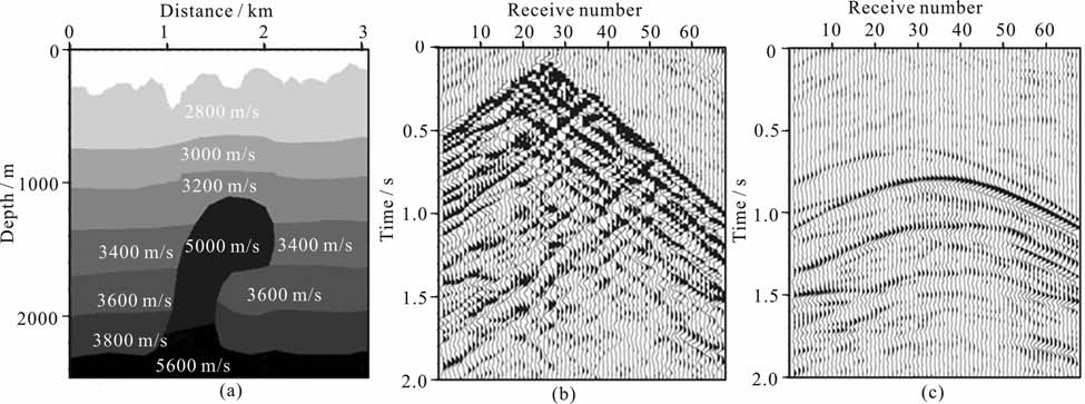 图 10a为一个包含复杂地表的盐丘模型,速度分布如图所示.模拟该模型的主要目的是对来自盐丘的强反射能量与复杂地表强散射能量进行比较.震源位于水平距离1350m, 自由表面下25m 处,数值模拟得到的自由表面接收合成地震记录如图 10b所示.由图可见,地表强散射噪音能量很大,弥漫整个剖面,具有一定的相干性,干涉和淹没来自地表下各地层和盐丘的反射信号.图 10c为把起伏地表变平进行数值模拟得到的合成记录,来自盐丘的强反射在此炮集上很突出.由此可见,剧烈的起伏地表是降低地震资料品质的主要原因之一.