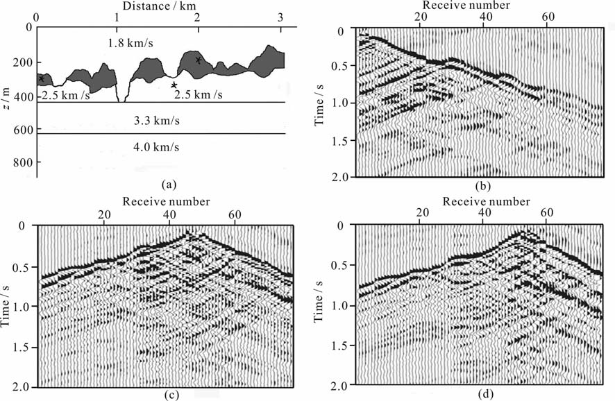 图 11 崎岖地表低降速带复杂近地表模型地震模拟 (a)复杂近地表模型;(b)左边放炮地表接收合成炮集;(c)中间放炮地表接收合成炮集;(d)右边放炮地表接收合成炮集. Fig. 11 Synthetic seismograms for complex near surface model with rugged free surface and low subweathered zone (a) The complex near surface model;(b) The synthetic seismograms with the source on the left;(c) The synthetic seismograms with the source at the center;(d) The synthetic seismograms with the source on the right. |