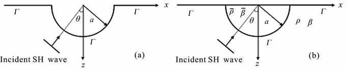 图 3 半圆峡谷模型(a)和均匀沉积谷模型(b)及SH 波入射示意图 Fig. 3 Geometry of semicircular canyon topography model (a) and semicircular valley with homogeneous medium model (b) with incident SH waves |