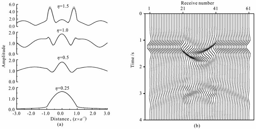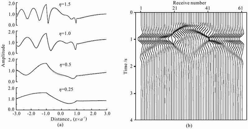 图 4 半圆峡谷模型的地震响应 (a)SH 波45°入射地表各点对不同η 值的振幅响应(实线为解析解,虚线为数值解);(b)SH-波垂直入射地表各点的地震合成记录. Fig. 4 The seismic responses of the semicircular canyon topography model (a) The amplitude response for various n with 45° incident harmonic plane wave(solid lines denote the exact solutions and the dots denote numeric results) ; (b) Synthetic seismograms with 0° incident harmonic plane wave. |