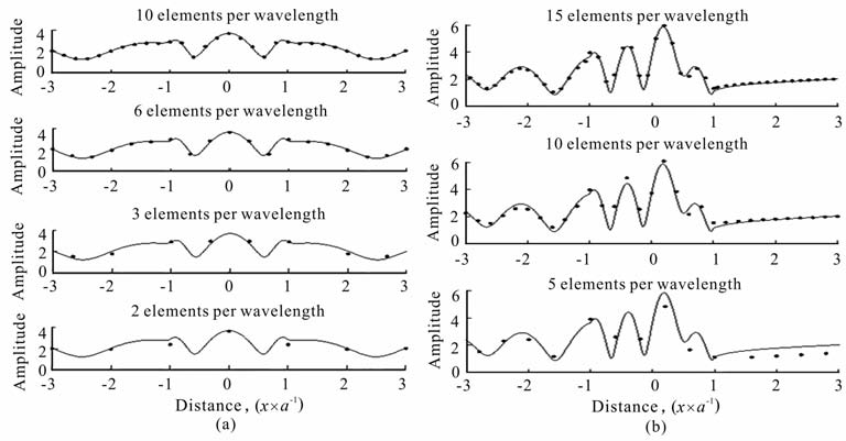 图 6 SH-波入射沉积谷模型(垂直入射(a),60°入射(b))对不同离散单元长度进行数值模拟得到的η =1时地表各点的地震振幅响应(实线为解析解,虚线为数值解) Fig. 6 The seismic responses of the semicircular valley model (0° incident SH wave (a) and 60° incident SH wave(b) with the dimensionless frequencies η=1 for various sampling rates (the solid lines denote the exact solutions and the dots denote numeric results) |
