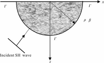 图 7 半空间随机非均质沉积谷模型 Fig. 7 The semicircular valley with random heterogeneous medium model in the half-space with incident SH wave |