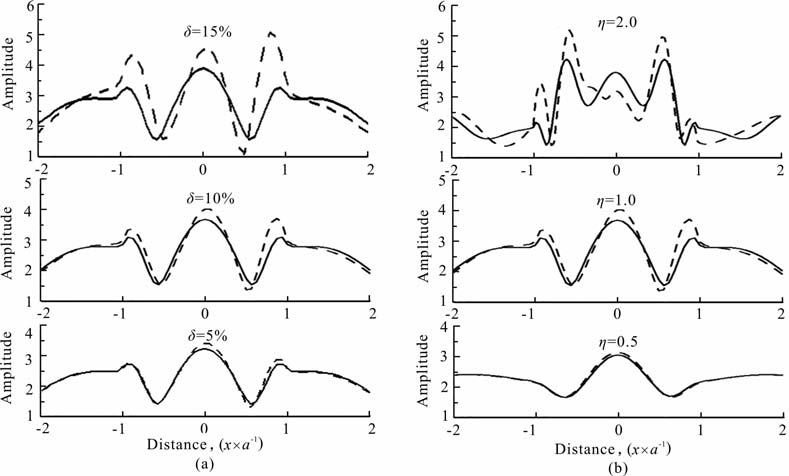 对大部分近地表而言,地表下低降速带的速度扰动量变化一般为5%~15%之间.例如,对谷内平均速度β=3000m/s进行δ=10% 的扰动,实际谷内随机速度分布在2700~3300m/s之间.假定谷内介质平均速度β和平均密度为ρ 满足:ρ/ρ=1.5和β/β=2,取速度扰动量δ 为0%、5%、10%和15%,对随机非均质沉积谷模型进行数值模拟,图 8a为 SH-波垂直入射地表各点对η =1 时振幅响应.可见,对于δ>10%后,谷内随机非均匀体积介质对地面地震响应产生较大的影响,波场振幅扰动非常强烈,特别是在半圆两端垂直拐角点的散射波场变化剧烈.图 8b为取δ=10%时,SH-波垂直入射地表各点对不同η 值的振幅响应,可见,谷内随机非均匀体介质对高频地震响应产生更大的影响.