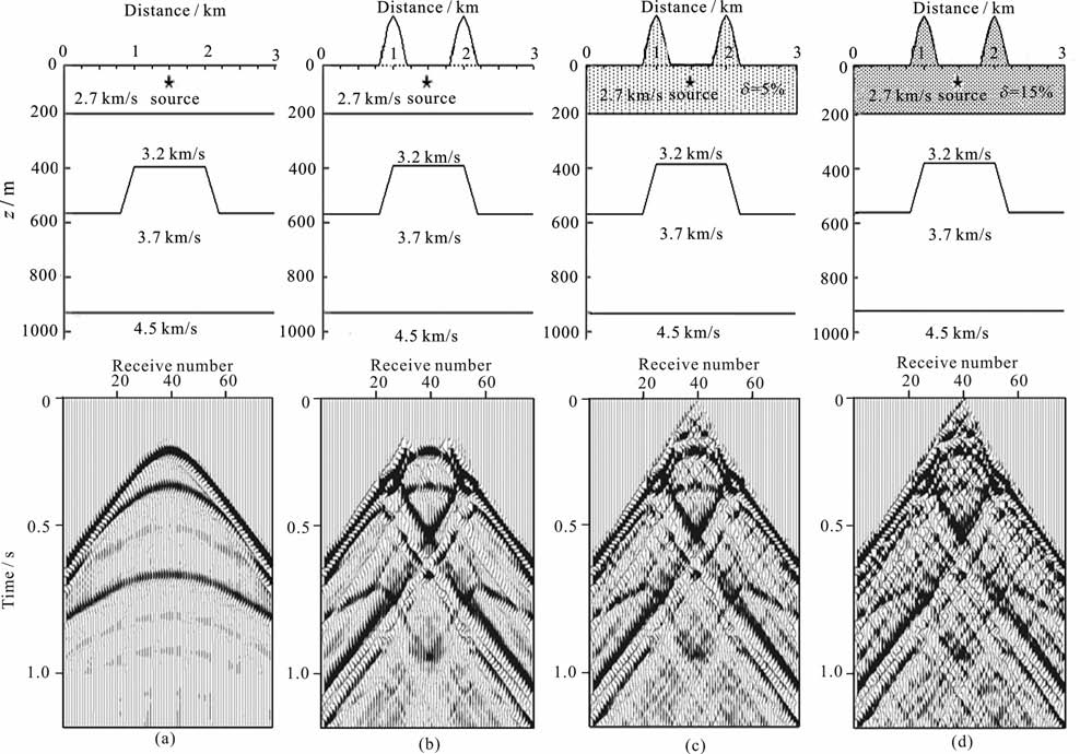 图 9 不同复杂程度近地表模型及其对应的地表合成地震炮集记录 (a)平地表匀均介质近地表模型及其地表合成地震炮集记录;(b)起伏地表模型及其地表合成地震炮集记录;(c)起伏地表弱非均质(δ=5%)近地表层模型及其地表合成地震炮集记录;(d)起伏地表强非均质(δ=15%)近地表层模型及其地表合成地震炮集记录. Fig. 9 The models of different complex near surface and the synthetic seismograms for these model (a) The homogeneous near-surface mdoel with flat topography and its synthetic seismograms; (b) The homogeneous near-surface model with rough topography and its synthetic seismograms; (c) The weak heterogeneous near-surface model (δ=5%) with rough topography and its synthetic seismograms; (d) The strong heterogeneous near-surface model(δ= 15%) with rough topography and its synthetic seismograms. |