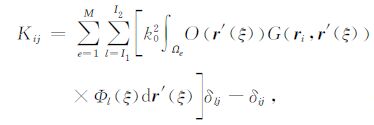 式中左边的各个子矩阵分别为利用公式(9)、(10)、(11)计算得到的边界Γ0 上的各个离散点和边界Γ1上的各个离散点以及非均质区域内的各个散射点的相互作用积分算子矩阵;式中右边的各个子向量分别为利用公式(4)计算得到的点源激发对边界和边界Γ1 上的各个离散点以及非均质区域内的各个散射点的作用产生的震源项向量.