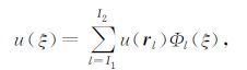 3 积分方程的数值离散广义Lippmann-Schwinger 积分方程中,震源项u0(r)为已知,由计算频率和源点r0 确定,u1s(r)和u2s(r)分别为散射体边界和内部各点上的未知量.积分方程离散常用的方法为配置法,以二维问题为例,首先把边界Γ 划分为L个互不重叠的线性单元Γe(e=1,2,…,L),域Ω 剖分为M个三角形或四边形单元Ωe(e=1,2,…,M).假定边界加上内部共有N个节点,并统一节点号.对于各个变量(r,u,∂u/∂n)在单元内任意点的值,利用插值型函数Φ ,可以近似地表示成相邻节点I1 至I2 的线性和,例如位移函数可表示为: