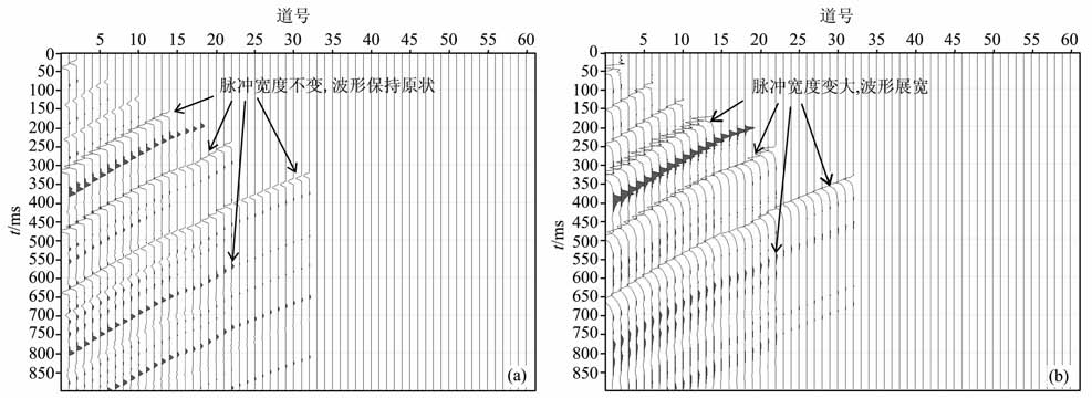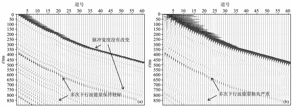 图 1是对模型生成的零偏VSP 下行波场正演的结果.其中,图 1a是不含有吸收衰减特性的正演记录,图 1b是各层均具有不同品质因子的正演记录.通过对比可以看出:两者特征一致,各同相轴到达时间准确、相位一致.因为第5个反射界面的反射系数为负值,两者均发生相位反转.不同之处在于:后者的地震波能量损失严重,波形随着地震波不断向下传播而逐渐展宽,频率降低.