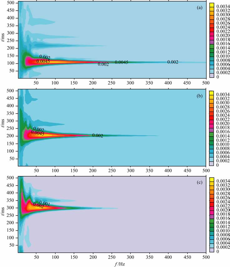 图 3 第10、20和30接收道时频分析对比 (a)第10道数据时频分析(检波点埋深250m);(b)第20道数据时频分析(检波点埋深500m);(c)第30道数据时频分析(检波点埋深750m). Fig. 3 Frequency analysis of three channels with different depths (a) Frequency analysis of the tenth channel underground 250 m;(b) Frequency analysis of the twentieth channel underground 500 m;(c) Frequency analysis of the thirtieth channel underground 750 m. |