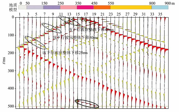 再次将震源深度调整到地下350 m, 即位于第4、5层的分界面上,需要注意的是,该震源位置的上方含有三个反射界面,正演结果见图 5.为了便于观察,将地质模型分层标注到了地震记录上方.从震源点的位置开始,地震波分别向上、向下传播,震源点位置处能量最强,随着远离震源点,地震波传播时间增加,能量逐渐减弱;当直达波向上(或向下)传播遇到分界面时,产生反射和透射,生成向下(或向上)的反射波.但是,从图 5中可以发现:震源处下行波(实线椭圆)及震源上方地层的三个下行波(虚线椭圆)在直达波到达之前就开始出现在分界面处,出现了向上时移的现象,这表明了通过公式(8)计算得到的震源上方的下行波存在提前到达的误差,不符合地震波传播规律.计算分析得知,震源上方的地层产生的下行波上移时间量恰好是地震波在对应反射面之上的那个地质分层中的走时(地震波在第2 层中的走时25ms, 在第3层中的走时50 ms, 在第4层中的走时45ms).