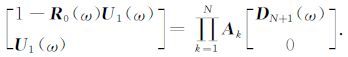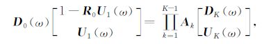 对于N层介质,因为N层之下没有上行波,即UN+1=0;另外,当输入震源信号是单位脉冲时,自由界面反射系数为R0(ω),则第一层的上行波、下行波之间存在如下关系式: