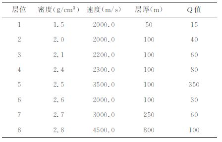 2.2 模型应用为了验证上述原理的正确性及显示地震波衰减特性,设计一个8层的地质模型,每层具有不同的品质因子,而且将第5层设计为高速致密的厚层,第6层为低速疏松的薄层,其参数如表 1所示.震源位于地表 0 m, 检波点间距25 m, 第一个检波点位于井中25m, 共60 道接收.同时利用Wyatt理论进行 SVSP记录的正演,以期通过对比揭示吸收衰减的特征.