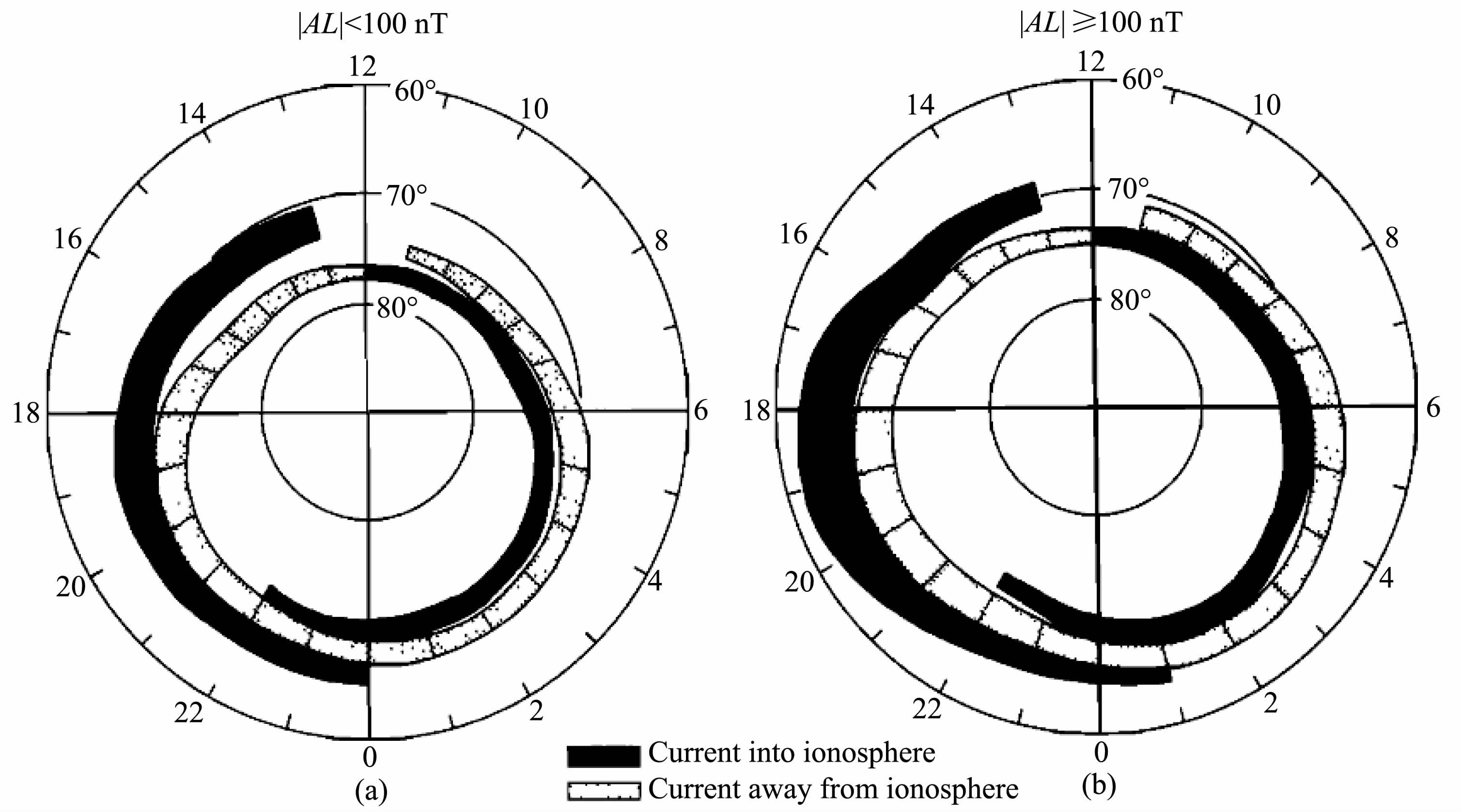 图 1 大尺度场向电流的分布(引自Iijima和Potemra,1978[3]) (a)弱扰动情况;(b)强扰动情况. Fig. 1 The distributions of large-scale FACs (By Iijima and Potemra,1978[3]) (a)Weak disturbance;(b)Intensive disturbance. |