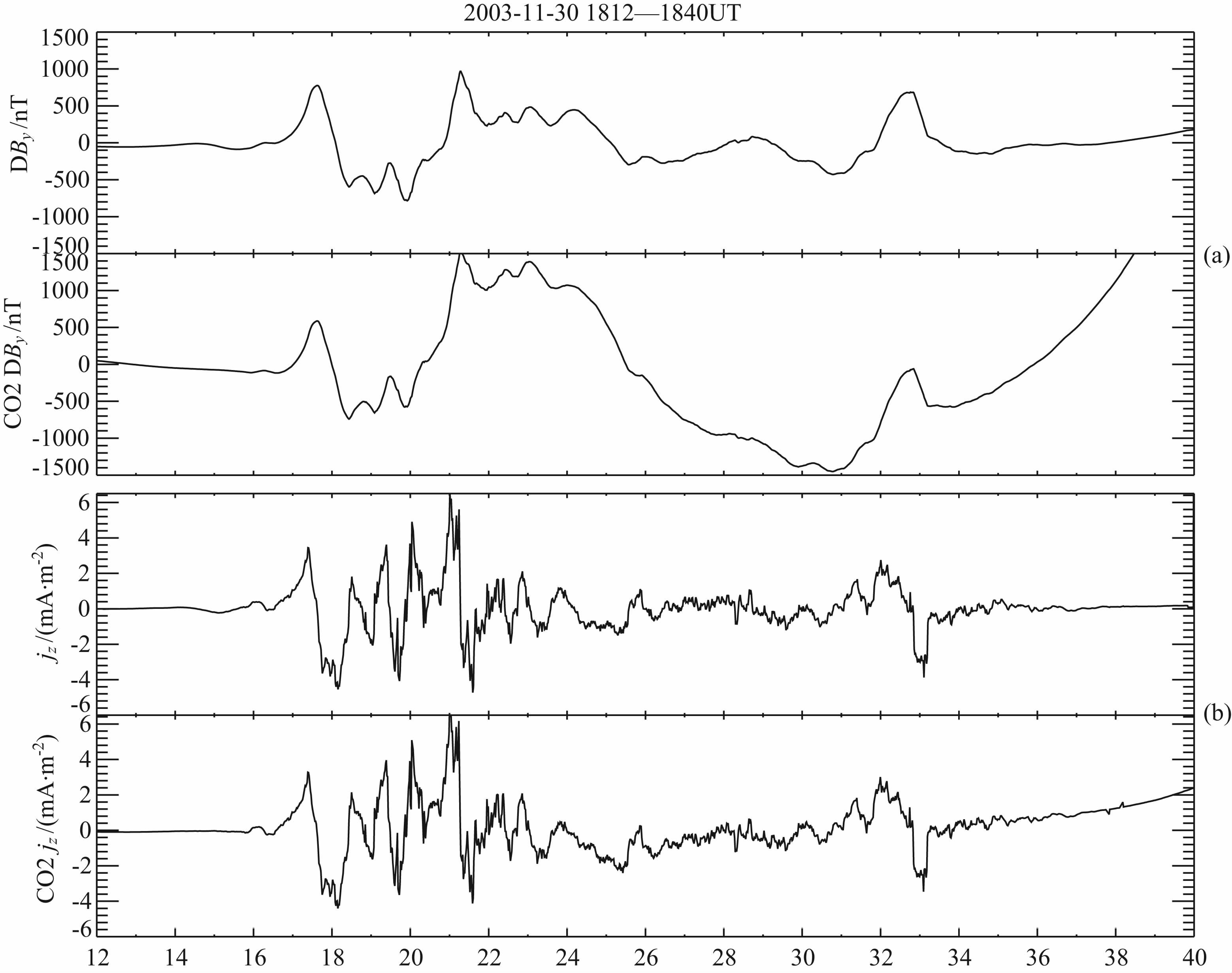 总结前人的研究,本工作以磁场y分量的5min 平滑值为背景进行扣除,即去掉了时间尺度大于场向电流的低频变化,消去背景磁场后,利用公式(3) 计算电流密度.此外,为了去除几公里小波长剪切Alfven波的影响[16],进行20s(空间尺度150km) 的平滑滤波.为了对此扣除背景磁场方法的有效性进行验证,与CO2 模型的结果进行对比,见图 2a中1830UT 时刻附近,本工作方法去背景的结果要优于CO2模型.由图 2b可以看出,两种方法计算的电流密度结果非常吻合.扣除背景后,本工作将按照上段所述Iijima等的标准选取大尺度场向电流进行分析.计算得到的电流密度的方向定义为:北半球向下(流入)为正,向上(流出)为负;南半球向上为正,向下为负.为便于描述,把方向相同时间连续的一段场向电流定义为一个电流片.