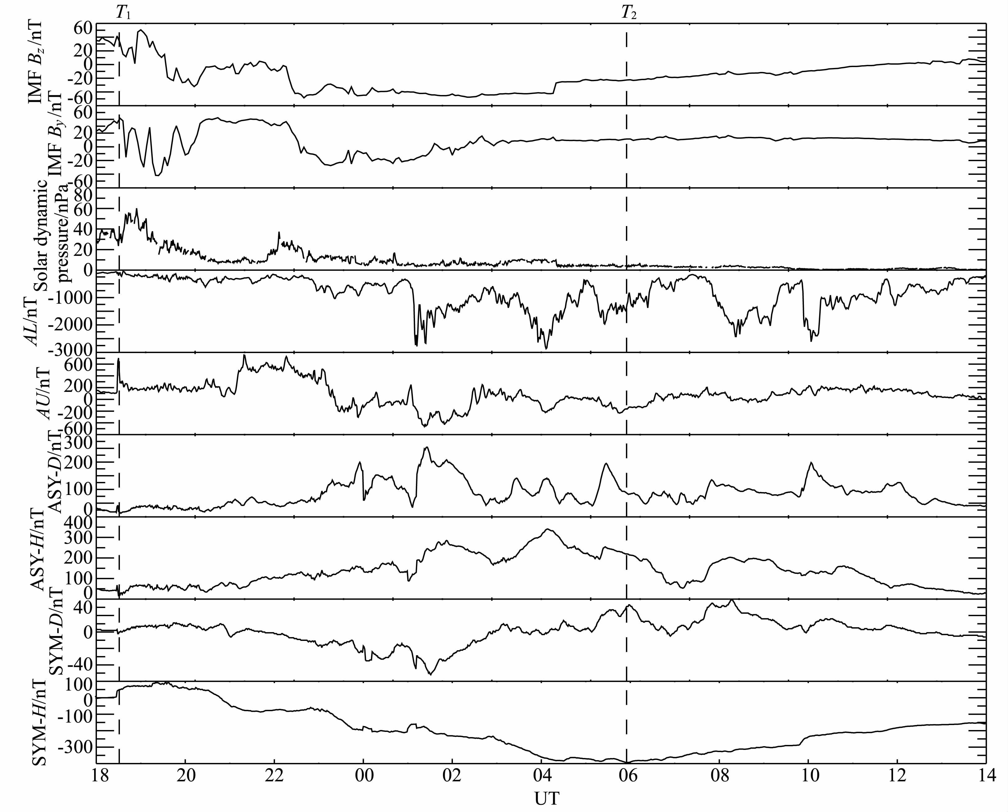 图 3给出了2004 年11 月7-8 日磁暴主相期间的太阳风参数和地磁指数的变化,图中从上至下依次为IMFBz、IMFBy、太阳风动压、AL和AU指数、ASY-D和ASY-H指数、SYM-D和SYM-H指数.从SYM-H指数看出,7日到8日发生了一个急始型磁暴,T1 为急始时刻(7日1830UT 左右),T2 为最大相时刻(8 日0600UT 附近),此时环电流指数达到了-380nT,表明该磁暴是一个巨型磁暴,其恢复相持续了很长时间至11日.