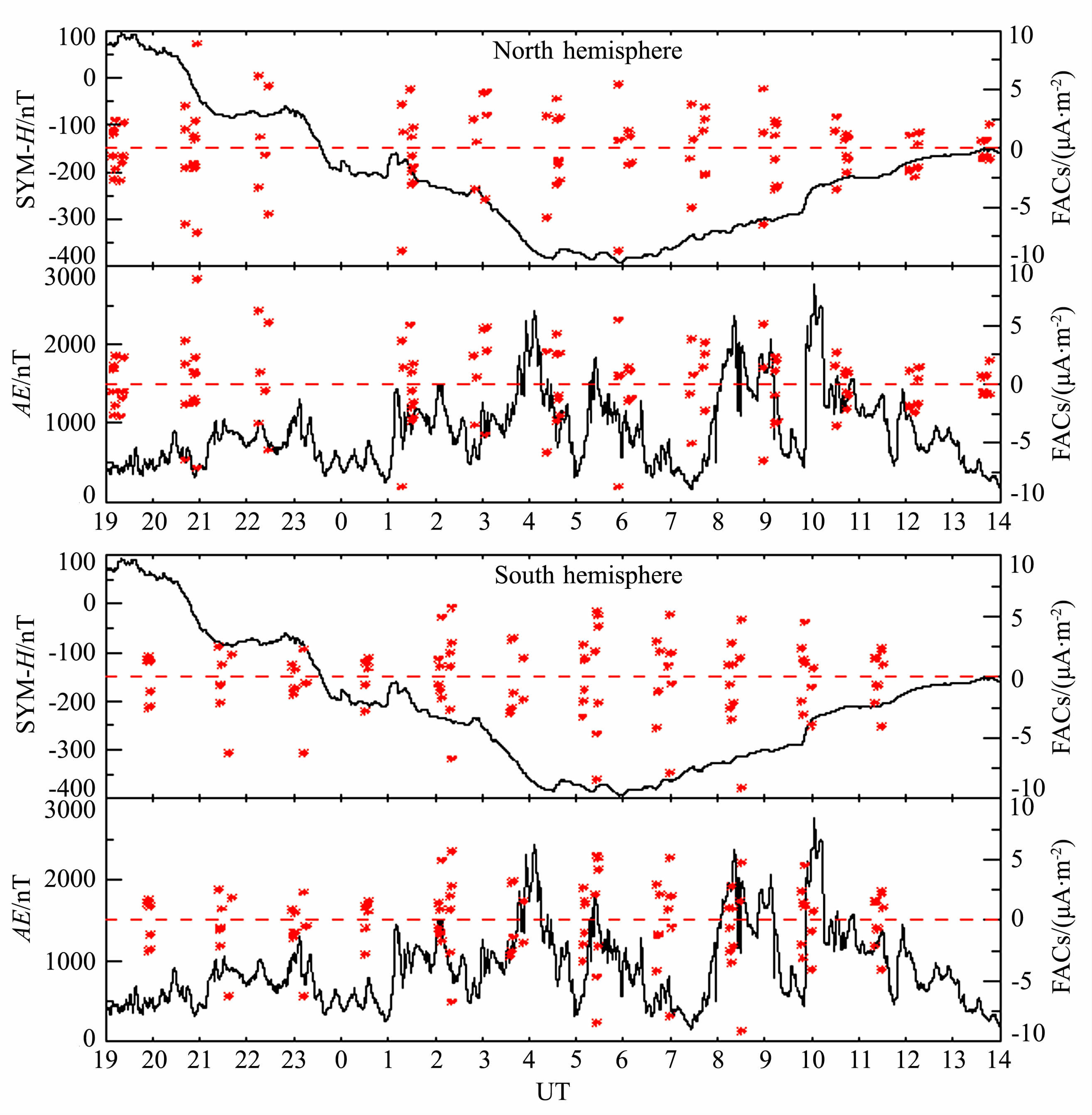 分析北、南半球各自的大尺度场向电流在暴时的UT 分布,同时对比SYM-H指数和AE指数,如图 5所示,图中每个红色星号代表一个电流片,右侧的y轴表示电流片的密度,黑色曲线代表SYM-H(或AE)指数,左侧y轴表示其大小.可以看出南北半球,大尺度场向电流片密度都基本随着环电流指数SYM-H的减小而增大,尤其是南半球(下图)在8日0200-0900UT 时段,SYM-H减小到-200nT 以下,电流片密度显著增大,部分密度超过了5μA/m2,最大达到了10μA/m2 左右.